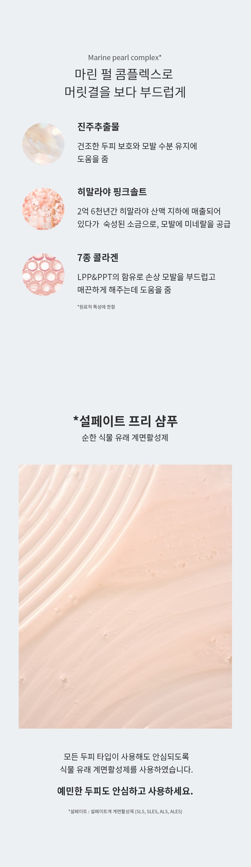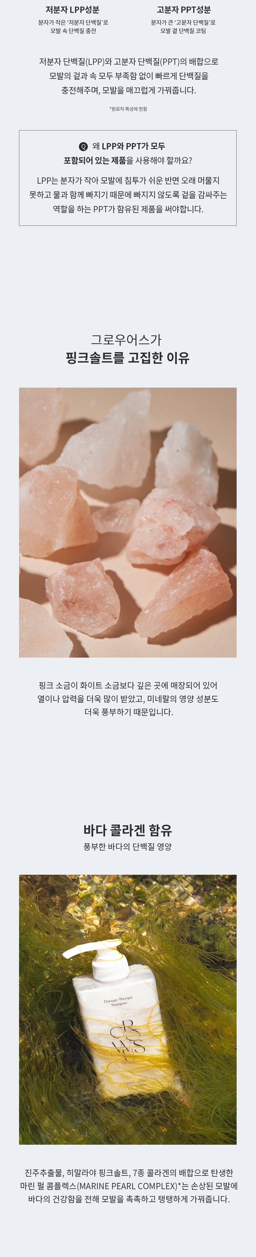採用低分子量蛋白質和高分子量蛋白質的組合,迅速補充頭髮表面和內部的蛋白質,使您的頭髮柔順。💇‍♀️✨ 提供含有喜馬拉雅粉紅鹽的礦物質。💎 提供含有海洋膠原蛋白的豐富海洋蛋白質。由珍珠提取物、喜馬拉雅粉紅鹽和7種膠原蛋白混合而成的海洋珍珠複合物,將海洋的健康帶給受損的頭髮,使其濕潤且有彈性。珍珠提取物保護乾燥的頭皮並保持頭髮水分。💦 使用喜馬拉雅粉紅鹽為頭髮提供礦物質。7種膠原蛋白有助於使受損的頭髮柔順絲滑。水楊酸可從毛孔中去除角質和皮脂。L-薄荷醇為頭皮提供清新感並有助於頭皮護理。Dexpanthenol可滋潤頭皮,形成保護性屏障。🌊💖